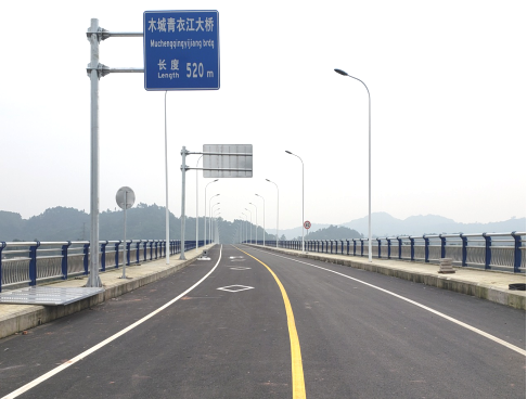 夹江县木城青衣江大桥位于夹江县木城镇境内,连接木城镇五里村和迎江乡群星村,千佛岩电站大坝下游约500米处,跨越青衣江及千佛岩电站尾水渠,2016年开工建设,2018年建成通车。桥梁全长520米,桥宽16米,桥梁上部结构采用13×20预应力砼简支小箱梁和68+120+68米预应力砼连续箱梁,下部结构采用双柱式钢筋混凝土圆柱墩。