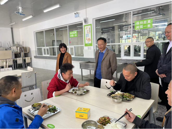 督导组一行检查了学校食堂及周边环境,查看了食品制作和备餐、设备设施、食品安全宣传展板设置等情况,重点督查了食堂操作区、消毒区、备餐区、就餐区等重点区域。督导组一行还详细了解了师生餐食标准、营养搭配情况,并就如何提高师生就餐满意度提出了建议。为深度体验英才小学食品安全情况,易志隆一行还全程陪同师生共进了午餐。